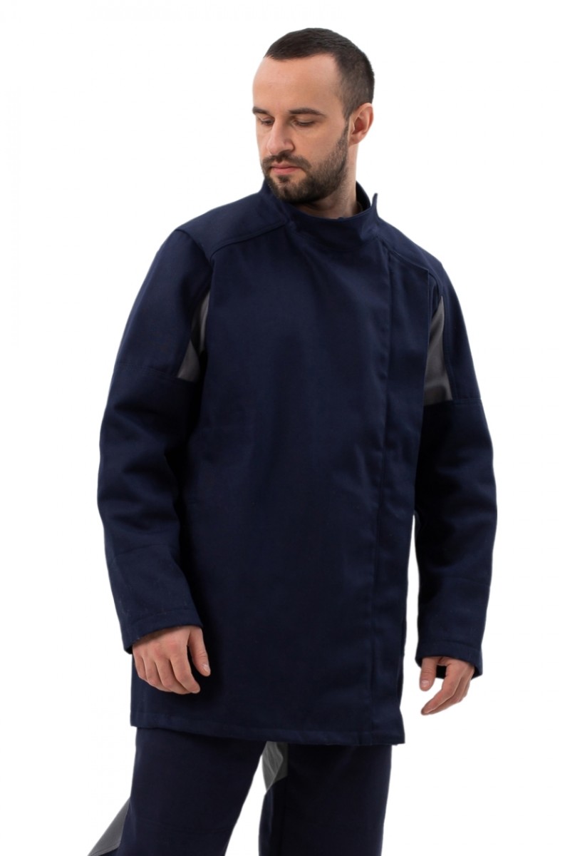 ➠ Куртка прямого силуэта с правосторонней застежкой на тесьму –«молнию» и кнопки с дополнительной внутренней защитной планкой. Такая конструкция способствует плотному прилеганию изделия, исключая попадание искр и брызг раскаленного металла в под одёжное пространство.